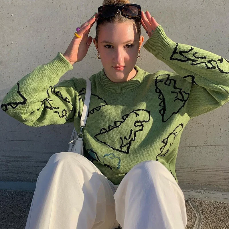 Product Description:O-Neck Long Sleeve Women’s Oversize Sweater Soft and comfortable Solid Dinosaur Printed Y2k Knitted Sweater Loose Casual Oversized Knitted Pullover Suitable for most women’s eyesight
